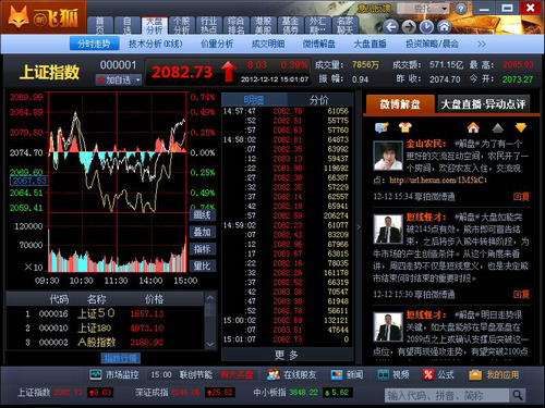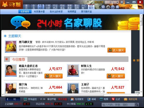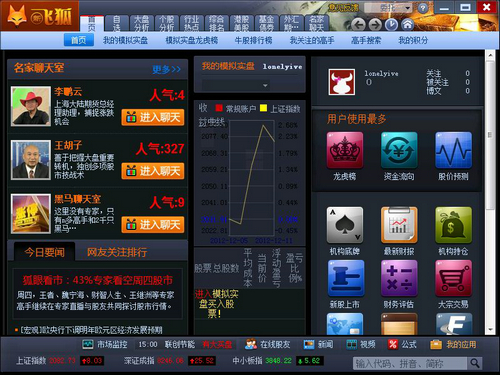 和讯新飞狐是中国高手互动金融云终端。和讯新飞狐是一套基于“六度空间”理论实名制的社会化网络(SNS)证券投资分析和价值评估免费软件。也是一个集聚互动社区、个人门户、即时通讯和组件平台为一体、以中小投资者为目标用户群体的web3.0时代的SNS商务平台。软件功能:软件包含有网络聊天(IM)、投资分享、高手直播、微博、网络社区等功能。和讯新飞狐通过人际关系为纽带的关联,形成了包括徐小明、凯恩斯、王者、令狐冲甲、隐者333、神仙看盘等众多知名专家在内的圈子式聚合平台。并且通过名家主导+实名制的方式,最大程度地减少互联网存在已久的虚假信息之祸,加强人际关系的信赖、活跃度和依附感。同时,通过名家解盘、圈子等专家式服务梳理出用户学习背景和工作背景的真实度和相近性。使得和讯新飞狐能够有效区分并梳理出用户的真实需求,并为他们提供的可信任人际托管服务。从而打造出全新的网上诚信平台,推进网上交易领域用户