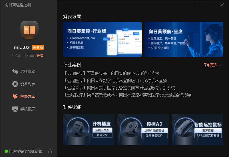 向日葵远程控制是国内知名远程控制服务商,打造完整软硬结合的远程控制体系,目前已研发向日葵远程控制软件及开机棒、开机插座、控控等多款硬件,通过软硬结合的方式提供完美的远程控制解决方案。支持电脑与电脑,手机与电脑,手机与手机相互控制;搭配开机棒/开机插座,随时随地开启电脑远控;搭配控控硬件,可穿透专网限制,跨越各种操作系统,远控各类工控设备。向日葵远程控制软硬结合的操作理念,为远程控制行业打开了更多的局面,提供更多难题的解决方案。向日葵远程控制软件的主要功能有远程控制电脑、屏幕白板、CMD/SSH、视频监控、桌面录像、远程文件、远程控制手机等。