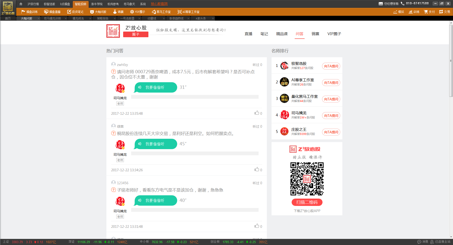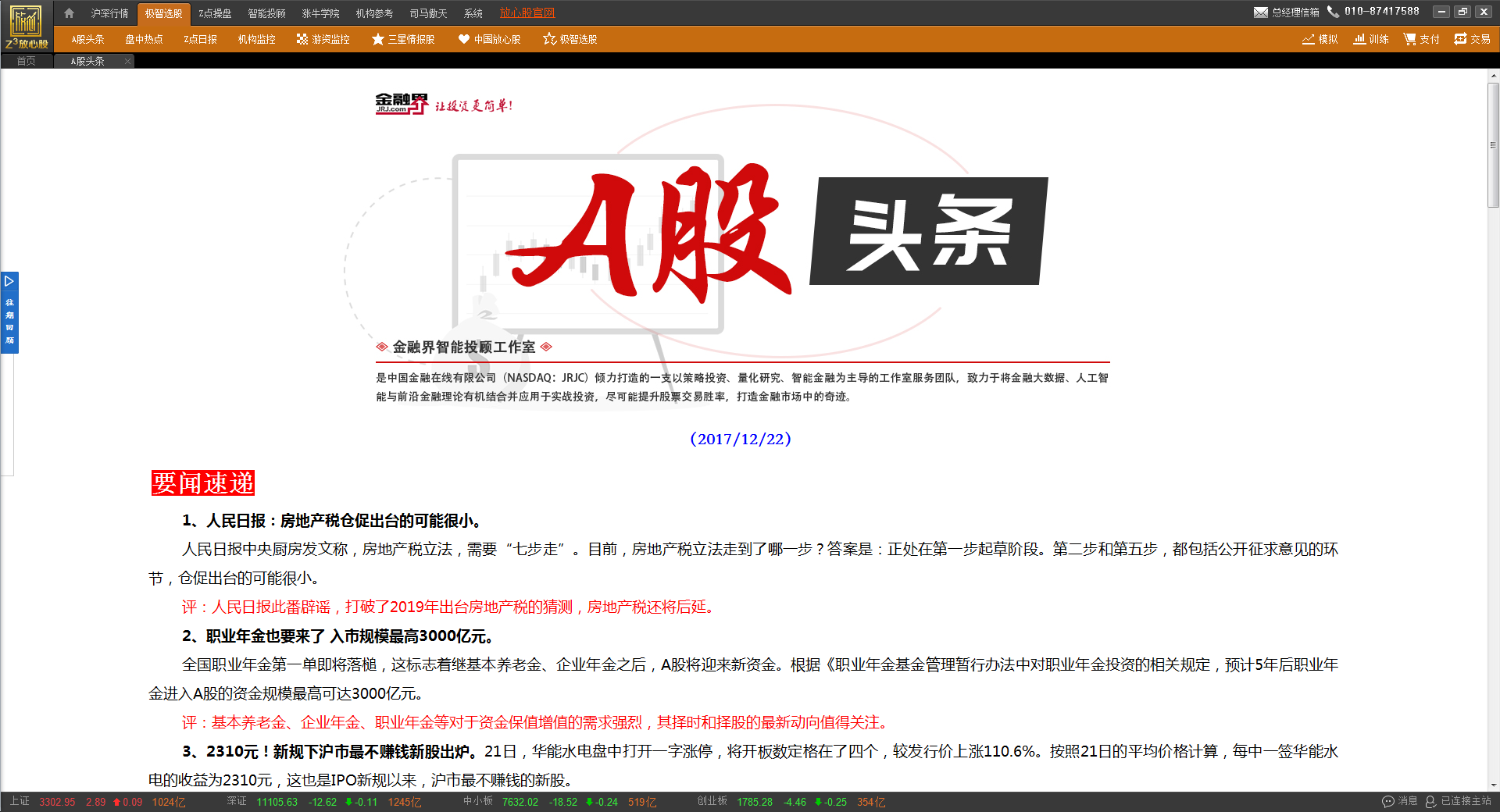 纳斯达克上市公司金融界(JRJC)打造“Z?智能金融超级引擎”平台——放心股,是一套包含了智能用户分析、智能客户服务、智能投资研究、智能投资顾问,以及底层数据分析系统等相互连接的多层次智能产品体系。我们的目标是:用Z?智能引擎赚钱,让投资更简单!让炒股更放心!