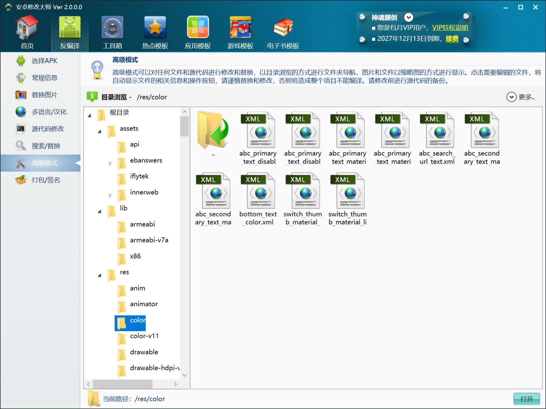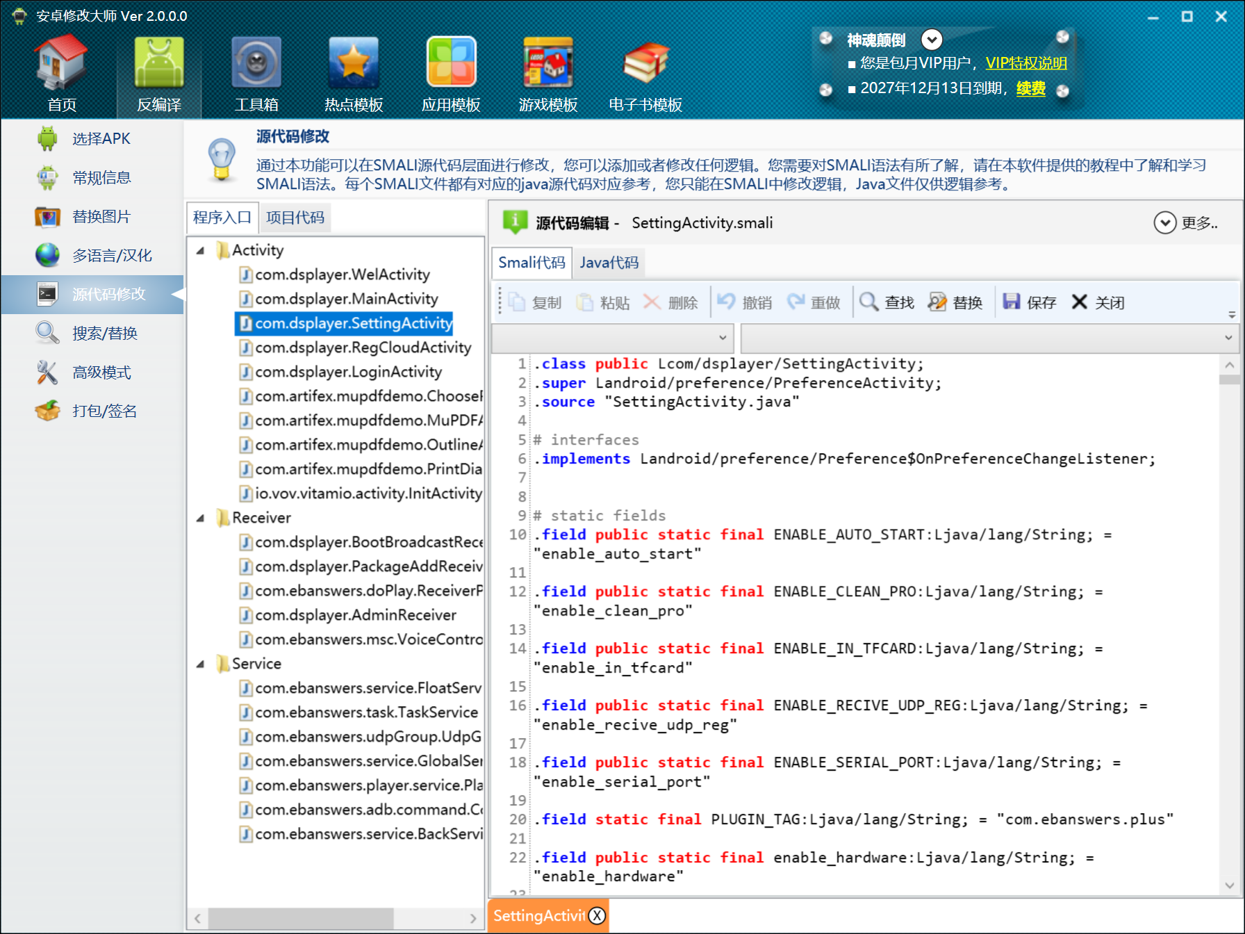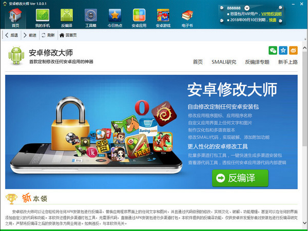 安卓修改大师可以让您轻松将任何APK安装包进行反编译,替换应用程序界面上的任何文字和图片,并且通过代码级别的修改,实现汉化、破解、功能增强,甚至可以在任何的界面添加自定义的代码和功能。本软件还提供多渠道打包工具,无需源代码,直接通过APK安装包进行多渠道打包。本软件提供的反编译功能,仅供安卓开发爱好者对安装包进行反编译研究之用,严禁将反编译之后的安装包作为商业用途。如有违反,与本软件无关。本软件需要您的电脑安装了 .Net Framework 4.0以上版本和JDK1.8以上版本方可正常使用。 软件主要功能: 1、任意反编译安卓应用:自由定制任何没有加固过的APK安装包,可以修改应用程序图标和应用程序名称、替换界面吗上面的任何文字和图片、翻译或者汉化制作多语言版本,更支持通过高级的SMALI代码,实现对应用软件的破解。 2、拥有海量安卓应用和游戏的模板,方便反编译:提供海量最新最全的应用作为定制模板,可以直接下载后进行反向工程、破解、修改、查看源代码、查看安装包信息等操作(部分应用由于做了加固,暂时不能进行反向工程)。 3、提供多渠道打包功能:通过已经打包的APK安装包作为模板,反编译后,动态修改配置文件或者SMALI代码中的渠道标志来实现批量重新多渠道打包,由于不是源代码级别的打包,所以大大提升了批量打包的速度和效率。 4、提供应用小插件功能:系统提供大量应用插件,任何没有编程基础的用户都可以利用本功能,在任何应用中添加弹出窗口、新版本更新、图片轮播、网页广告、将广告apk内置到反编译的应用中等等强大的功能。