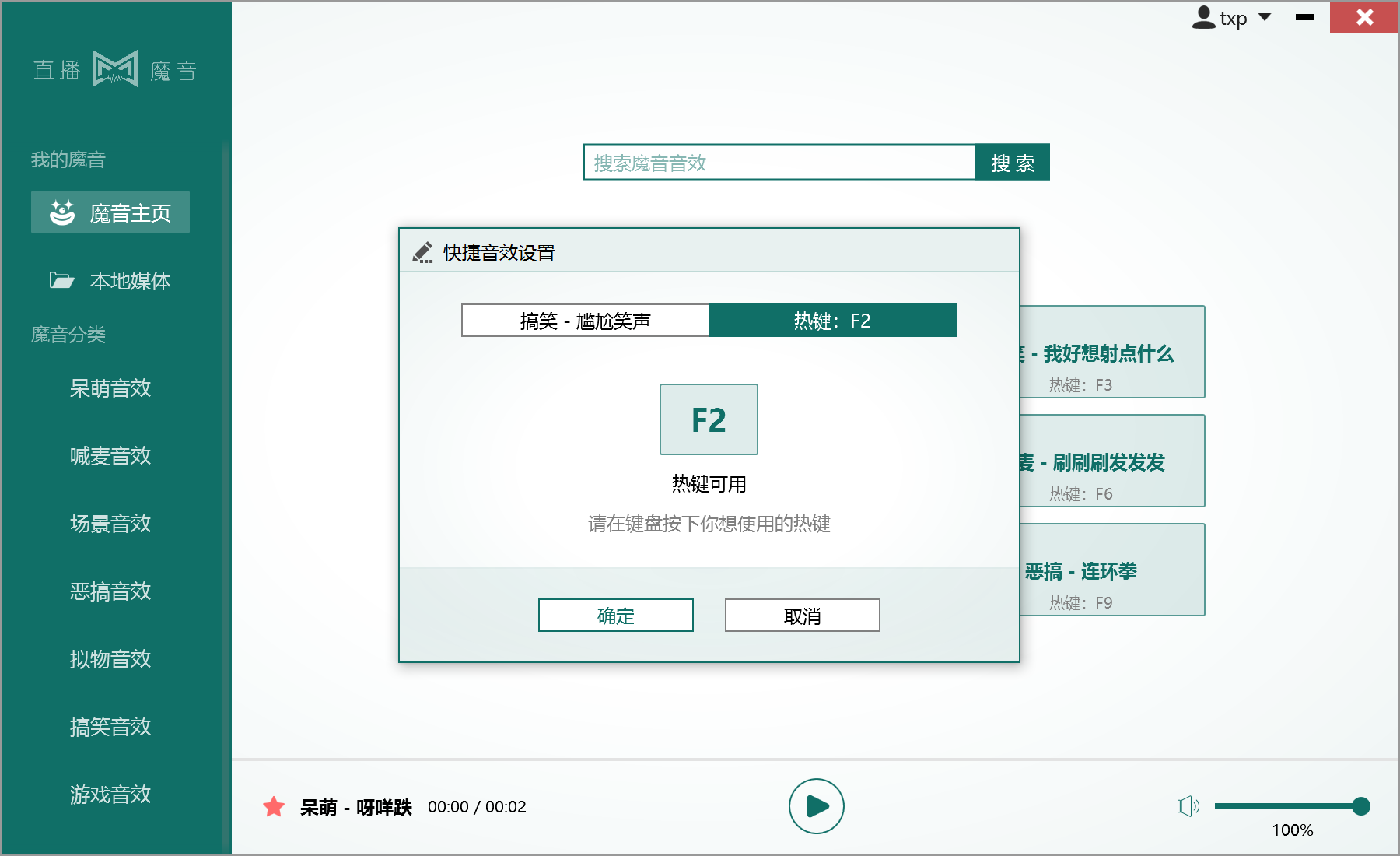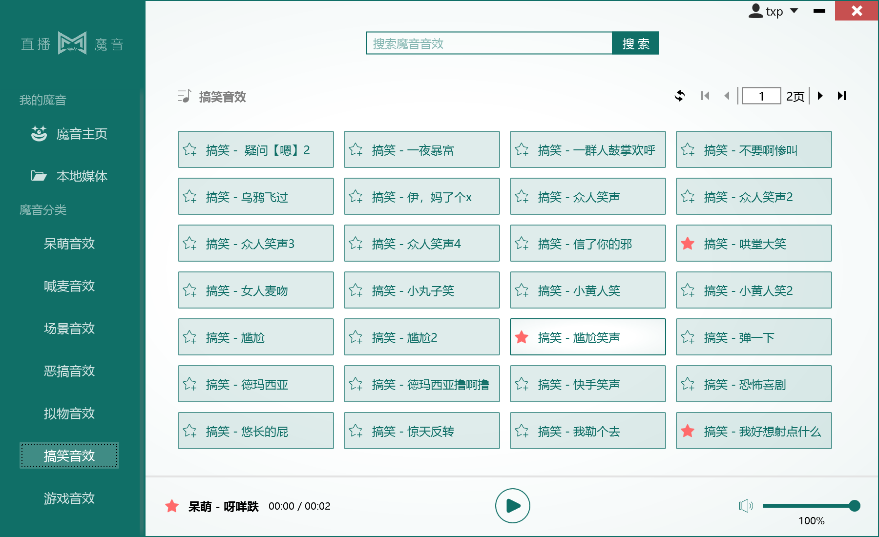 直播魔音软件为主播提供丰富快捷的音效播放功能,帮助主播活跃直播间气氛。 软件具有丰富的音效库,搞笑、恶搞、拟物、呆萌、游戏、喊麦等等各种类型,应有尽有。 软件支持全局热键播放音效,你可以将自己喜欢的音效设置为快捷音效,设置你习惯的标题和习惯的热键,方便你在直播的时候快速播放合适的音效。 软件会随时更新音效库,为主播们提供热门流行音效。