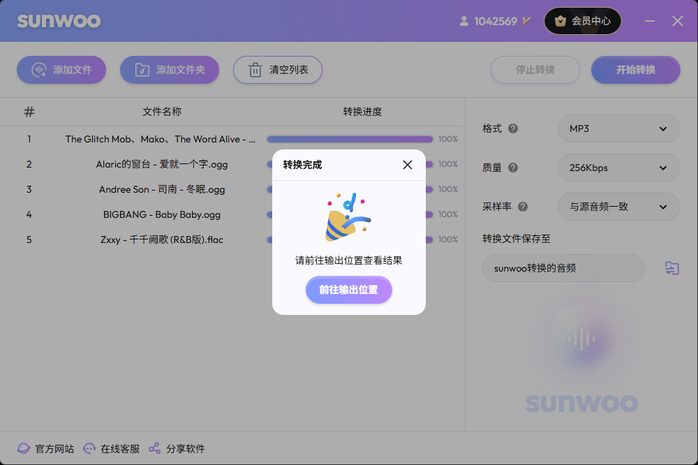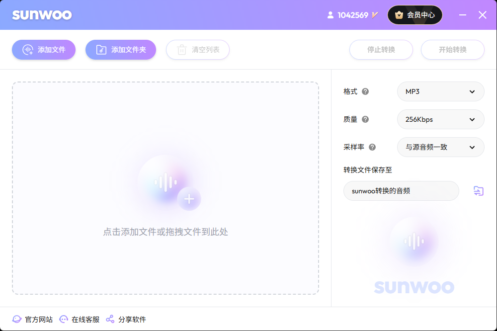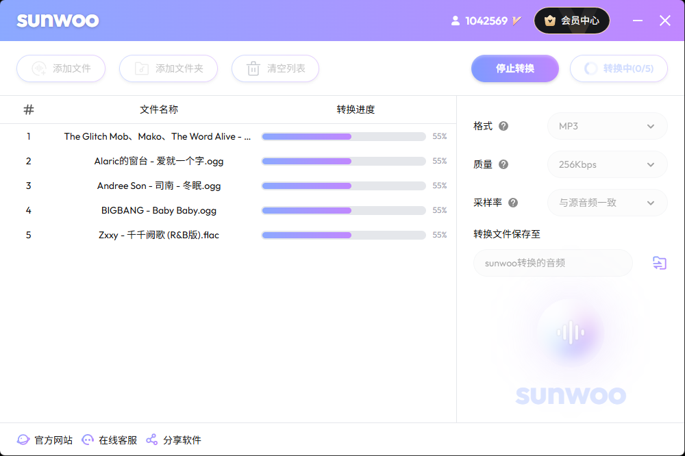 sunwoo音频格式转换器是一款专业高效的音频格式转换工具。支持主流与专业音频格式互转,充分利用多核心并发大幅缩短等待时间;提供比特率、质量、采样率、声道、响度等专业参数调节,兼顾音质与体积;支持本地批量处理、元数据自动保留,满足播客剪辑、内容分发、归档压缩等多种场景。